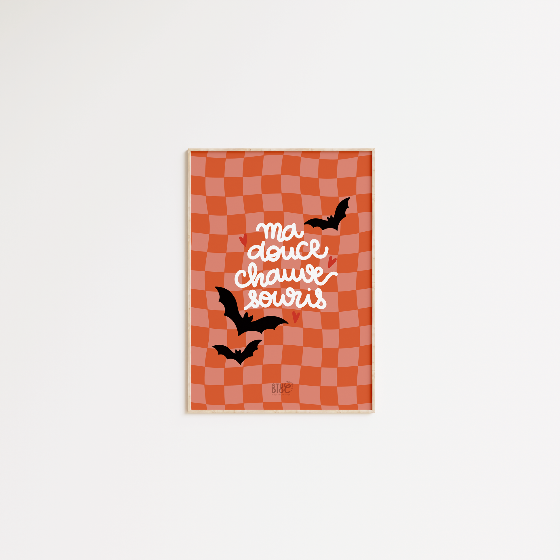 Cette affiche joue avec le côté mystérieux d’Halloween, mais version tendre et poétique, une chauve-souris qui n’effraie pas, qui rassure, et qui apporte une note de magie à ta déco.